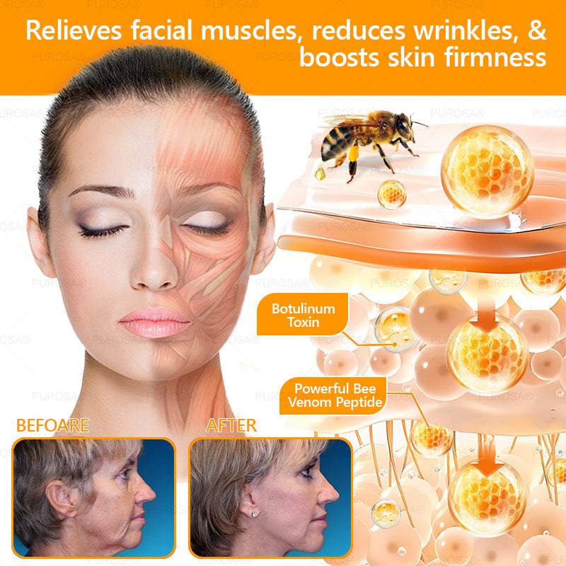 PUROSA® Bee Venom Wrinkle-Firming Multi-purpose Cream uses bee venom peptides to mimic the effects of Botox, relaxing facial muscles and reducing the formation of expression lines. At the same time, hyaluronic acid deeply hydrates the skin, making it plump and effectively smoothing fine lines and wrinkles. The combination of Acetyl Hexapeptide-8 and botulinum toxin targets deep wrinkles like forehead lines and crow's feet, leaving your skin looking firmer and smoother.